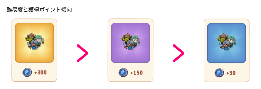 クエストには金と紫と青で難易度があり、もらえるポイントに差が出てきます。以下はその例です。