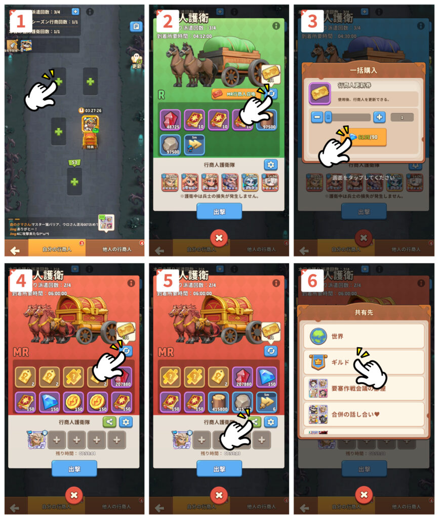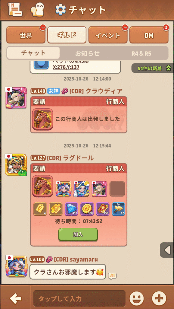 席がすべて埋まると、行商時間が減り、特定アイテムの獲得量が増えるので、ギルド内で埋まらなかった場合は世界チャットや招待したい人を招待しちゃいましょう!