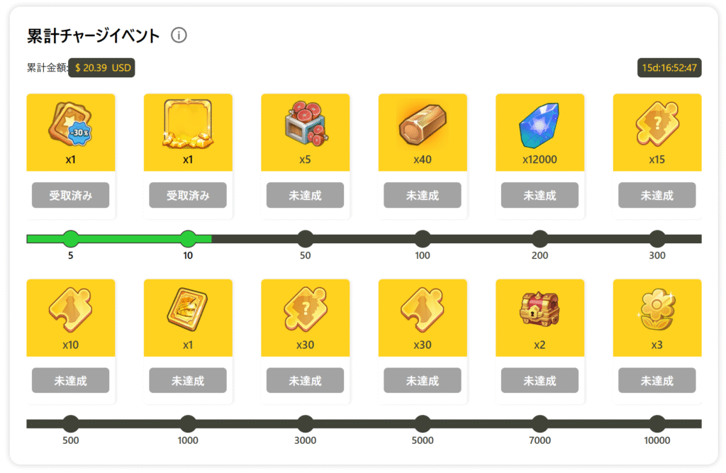 2.毎月1万円ほど課金する。→月500円分ほどの課金アイテムが購入可能に。