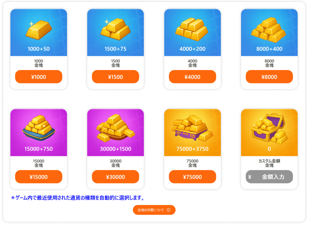 2.ログイン出来たら、下の金塊から課金したい分選択して支払いを行えば完了です。
