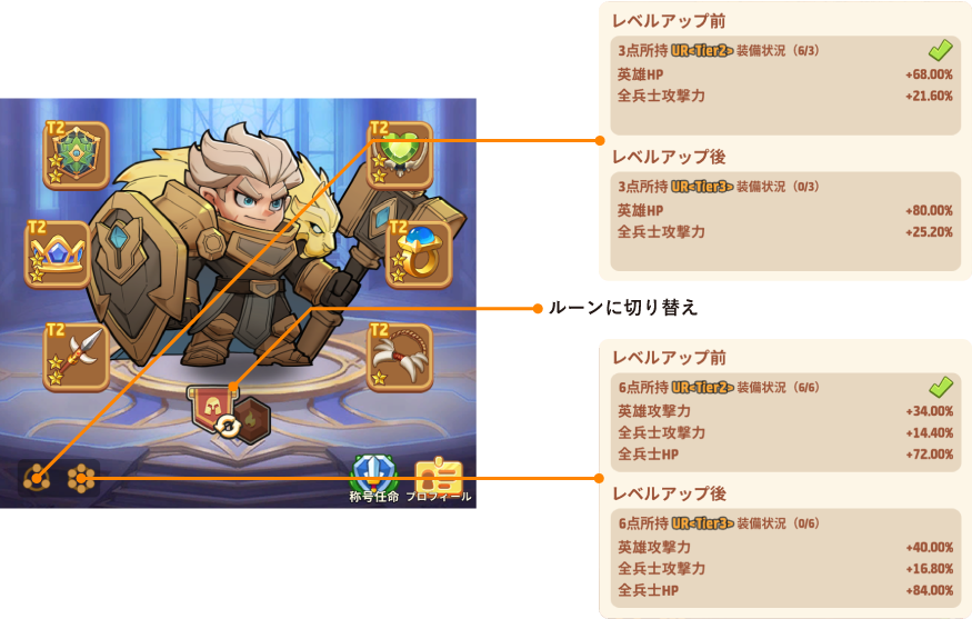 | パーティー攻撃力ルーン | 防御力 防御貫通 パーティ最大兵士数(Lv5~) |